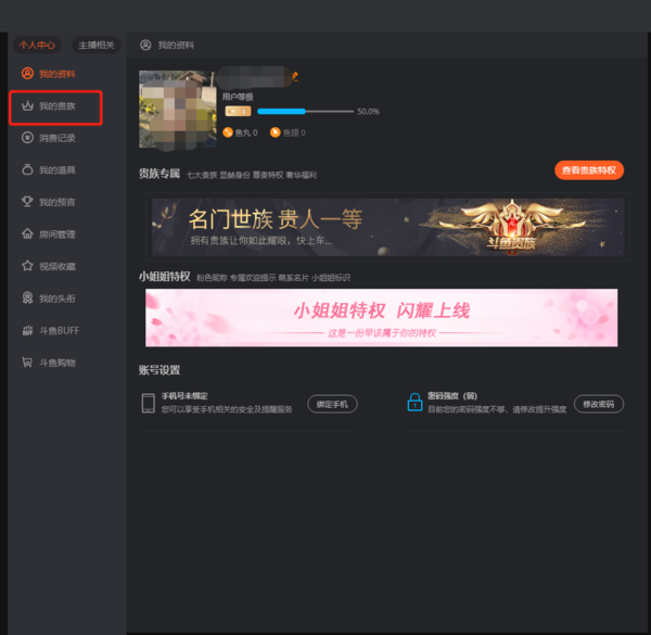 在斗鱼直播软件首页面右上方点击自己的头像,进入到个人信息页面。左侧栏中找到位于正数第二行位置的“我的贵族”,点击右侧的橙色“开通贵族”按钮,在贵族开通的页面中,选择想要开通的等级,最后点击右下角的“立即开通”,跳转到支付网页购买即可。