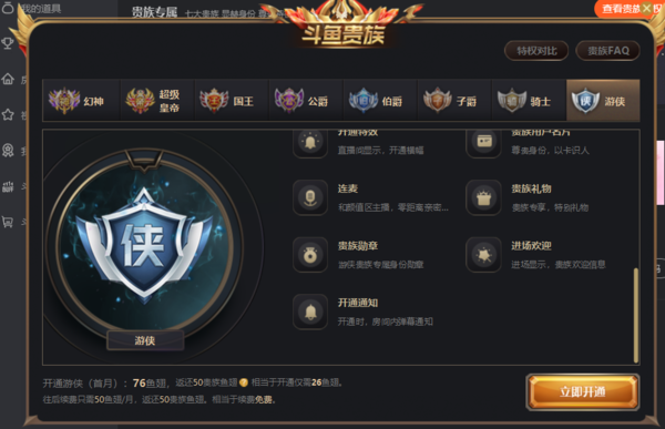 斗鱼直播的贵族等级共分为8个段位,其中最高等级“幻神”只能通过活动“创世幻神降临”获得,无法通过充值购买。其余7个游侠、骑士、子爵、伯爵、公爵、国王以及超级皇帝的价格不同,充值即可开通。