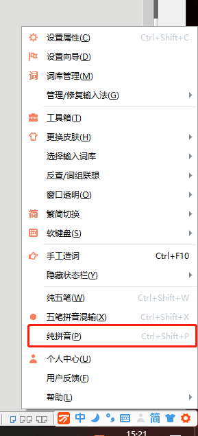 在输入法状态栏上方按下鼠标右键,弹出的菜单中点击“纯拼音”,再输入时,就变成了按照拼音的规则来显示的候选字词了。也可以使用快捷键“Ctrl+Shift+P”进行切换。