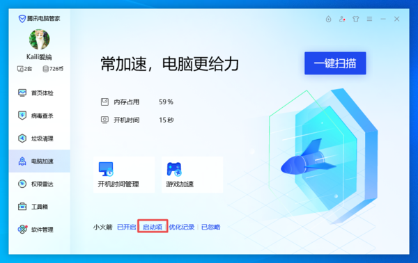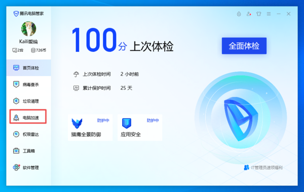 2.然后,打开电脑上的电脑管家软件,或者是其他可以设置软件开机自启动的软件,接着点击电脑管家界面左侧的【电脑加速】选项。