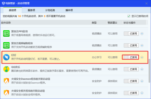 4.然后,我们在电脑管家的开机启动项管理界面当中,找到【钉钉】软件,并将它的状态设置为【已禁用】。