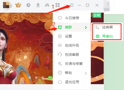 我们打开爱奇艺,点击右上角的【三道杠】图标,即可召唤扩展功能栏,其中一个按钮为【换肤】,我们将鼠标划到该按钮处,即可展现两种皮肤——经典黑和青春白,它们就是黑色主题和白色主题,黑色主题,和其他软件的“夜间模式”很像;因此这可以算是一种爱奇艺上调“夜间模式”的方法。