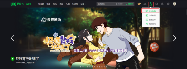 爱奇艺的上传视频功能,需要我们在浏览器中打开爱奇艺的官网,然后登录到自己的账号当中,接着在网页的右上角可以看到一个【云彩】的图标,下方的【发布作品】功能,就是爱奇艺的上传视频功能的图标。