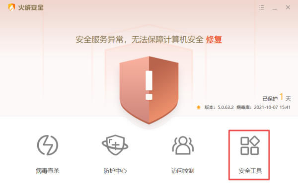 ①打开电脑当中的火绒安全软件,然后在软件的主界面中,找到【安全工具】选项并点击进入。