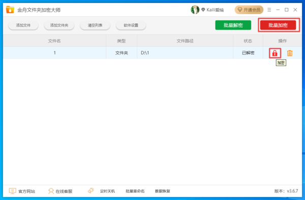 第三步,文件夹添加好以后,我们点击文件名最右侧【操作】一栏选项中的锁【加密】图标点击它,当然了,我们也可以点击界面右上角的【批量加密】按钮。