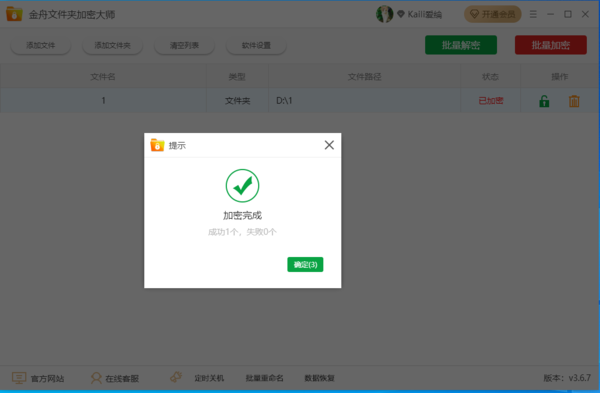 第六步,文件夹加密完成后,软件还会弹出【加密完成】,并显示【成功1个,失败0个】的提示信息。