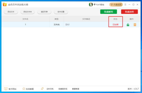 第七步,回到金舟文件夹加密大师软件的主界面当中,我们在文件夹右侧的【状态】中,便可以看到此时文件夹的状态为【已加密】的状态了。