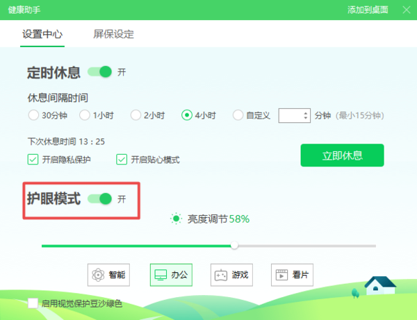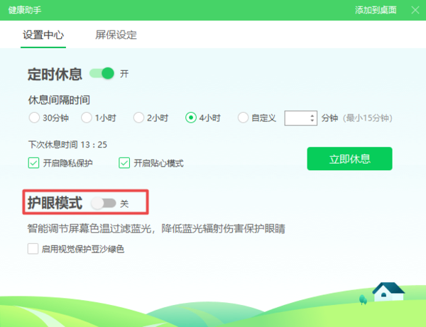 第三步,然后软件就会弹出健康助手窗口,此时我们将【护眼模式】进行关闭即可,开关变成灰色就代表功能成功的被关闭了,并且电脑系统的颜色也回归正常的状态了。