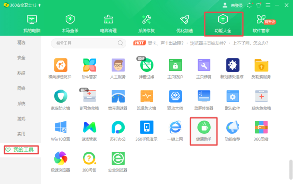 第四步,而我们再360安全卫士的【功能大全】界面中,在【我的工具】选项卡中,找到【健康助手】功能,点击它,也可以进行护眼模式的关闭。