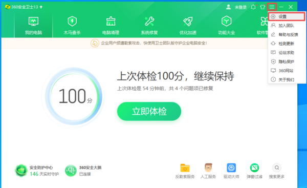 第一步,在电脑上找到360安全卫士软件,然后点击打开,进入到软件的主界面当中后,找到右上角的【三】主菜单图标,并点击打开,然后在弹出的选项中,选择【设置】功能。