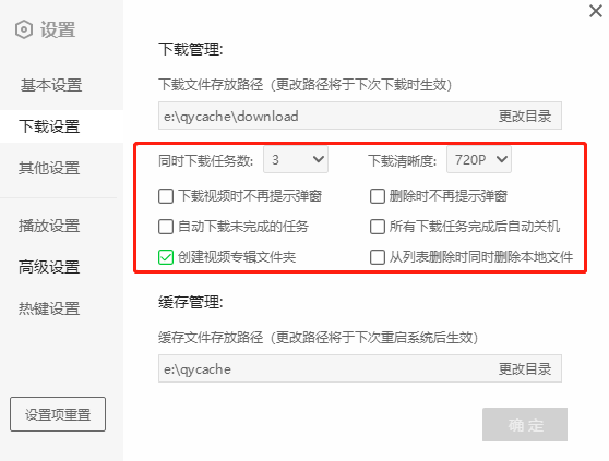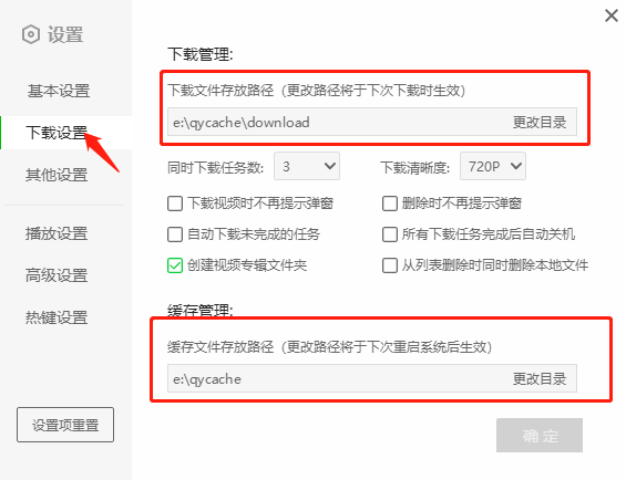 在我们召唤出下载框之后,点击【下载设置】,之后我们即可看到下载路径设置和缓存路径设置,我们更改完下载路径后,即可改变下载的视频文件位置;而缓存路径则是改变视频缓存的位置;个人认为下载路径的调整会更加重要,因为这样会方便我们找到视频文件。