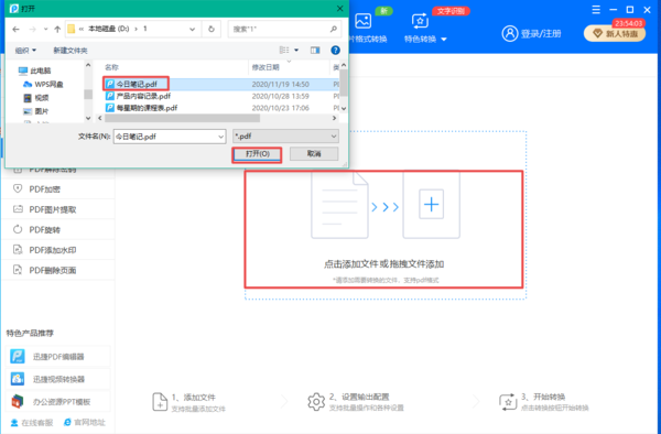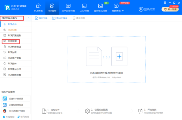第三步,然后在右侧的界面的中间位置,找到【点击添加文件或拖拽文件添加】的区域,然后将需要进行压缩的PDF文件添加到软件当中。
