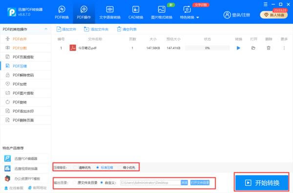第四步,PDF文件添加好以后,在软件界面的底部,我们还可以根据自己的实际需求,来对【压缩等级】和【输出目录】进行设置,全部设置好以后,点击界面底部右下角的【开始转换】按钮。