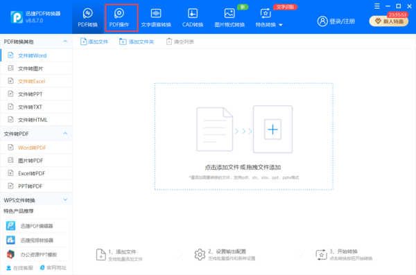 第一步,在电脑上下载并安装迅捷pdf转换器,软件安装好以后,将软件打开,进入到软件的主界面当中后,在界面的顶部找到【PDF操作】选项,并点击进入。