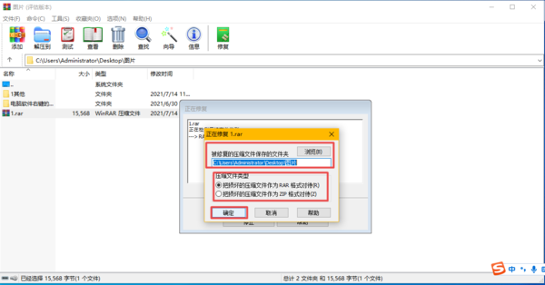 第三步,然后软件会弹出修复的窗口,我们可以根据自己的需要,来选择【压缩文件类型】以及【被修复的压缩文件保存的文件夹】,都设置好以后,然后点击【确定】按钮,然后软件就开始对已经损坏的压缩文件进行修复了。