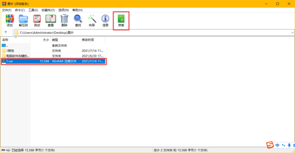 第二步,接着选中这个已经受损的压缩文件,然后点击软件界面顶部的【修复】功能。
