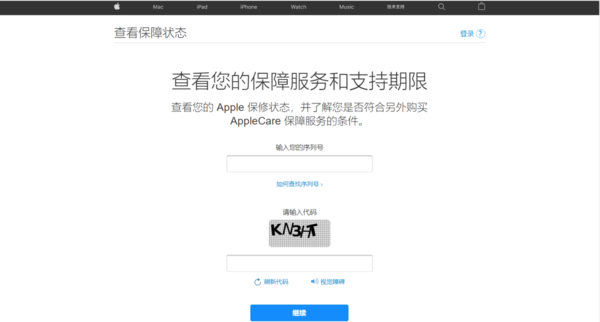 第七步,进入到相关界面当中后,在此界面中的【输入您的序列号】一栏中输入iPhone手机的序列号,也就是我们刚刚复制的序列号,然后再输入验证码,最后点击【继续】按钮进行查询。