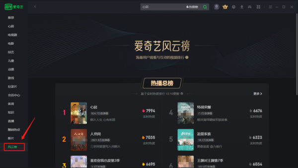 爱奇艺的电视剧热播榜单在风云榜模块中,打开爱奇艺客户端后,在左侧边栏的最下方可以找到“风云榜”的按钮,点击后右侧就会显示相关榜单的页面。除了热播总榜外,还分成了几个小的模块,如飙升总榜、必看总榜、电视剧榜、电影榜、综艺榜等。大家如果不知道要看什么,可以在自己需要的分类榜单中去找。