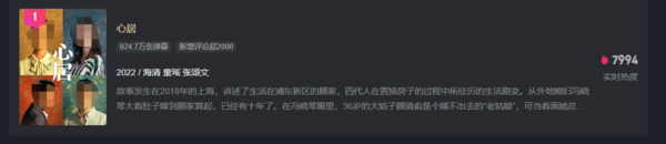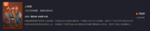 目前热度6966的人世间也同样是一部小说改编而成的电视剧,这部电视剧讲述的是十几名普通子弟在将近50年的时间里跌宕起伏的人生经历,以及社会巨变,是一部非常贴近真实生活的电视剧,由雷佳音、辛柏青、宋佳、殷桃等人领衔主演,可以说是一部具有年代感的温情电视剧了。