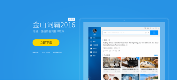 小编要推荐的第三课软件是金山词霸,它是一款面向个人的免费的词典、翻译工具,界面设计的非常简洁,并且功能还非常的强大,支持了中、英、法、俄文等七个国家的语言翻译,是学习外语必不可少的神器。