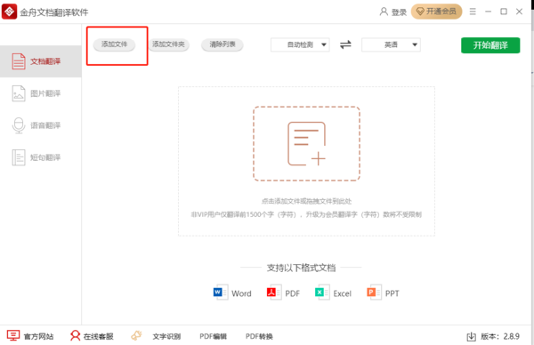 第二步:然后点击添加文件把需要翻译的文档上传到软件中,在操作界面的正下方,有显示当前支持的文档输入格式,根据要求上传即可。