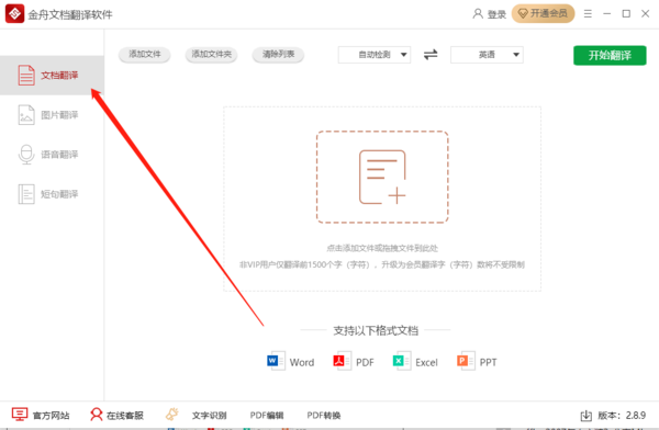 第一步:双击桌面图标,打开下载好的这款软件,在操作界面左侧选择第一个翻译功能文档翻译。