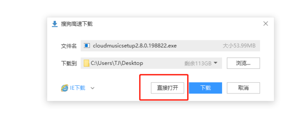 第三步:点击下载保存位置后面的浏览选项,点击“直接打开”能够不用下载安装包安装。