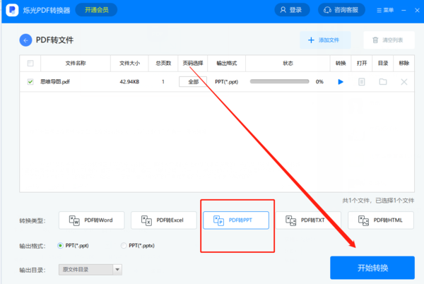 接下来就是选择要转换类型,选择好pdf转ppt之后点击软件下方有一个开始转换。