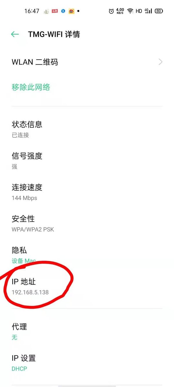 第二步,在新页面中,找到【IP地址】这一项,把这一串IP地址数字记下来,一定要记清楚哟,不能复制。