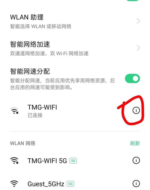 第一步,打开右击WiFi连接页面,找到已连接的WiFi名称,然后点击最后面的按钮,由于手机品牌的不同,可能按钮形状会不一样,但是位置还是一样的,不管长什么样,点击最后面一个即可。