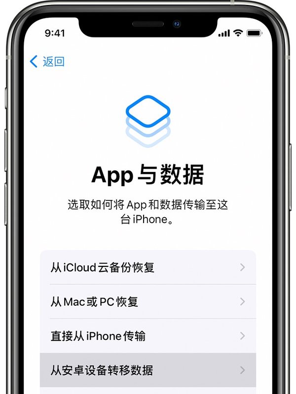 第二步,在设置新的iPhone手机设备时,我们需要留意【App与数据】界面,在此界面中,我们点击选择【从安卓设备转移数据】选项。而如果你的新iPhone手机已经完成了设置的话,那么此时我们需要抹掉ios设备,然后重新开始对新iPhone手机进行设置。