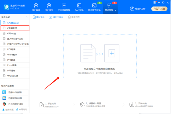 第三步,点开【特色转换】后在左侧功能区找到“CAJ转PDF”选择添加文件;