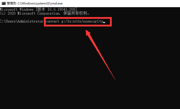 第三步,在【命令提示符】中输入【convert?g:/fs:ntfs/nosecurity】指令,然后按【回车】键确定即可。