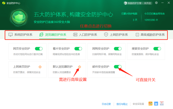 2、浏览器防护,主要开网页、看视频、网购、搜索、邮件安全防护等,从各个角度保护我们的上网安全。