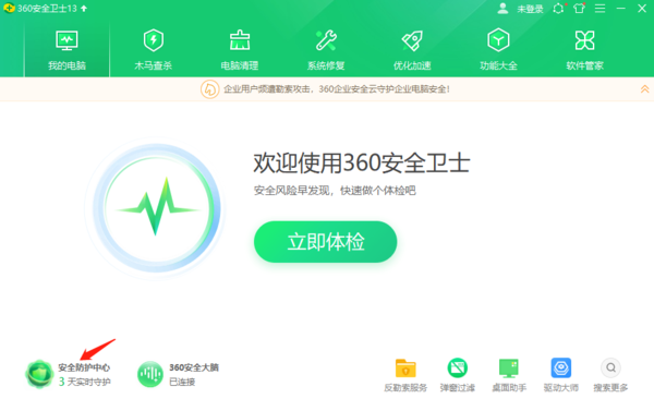 我们打开360安全卫士之后,即可在其界面的左下方看到【安全防护中心】,我们点击即可进入该模块;之所以该功能很容易被大家忽视,可能是这个按钮做的太像是“状态”,即“只能看,不能点”那种。