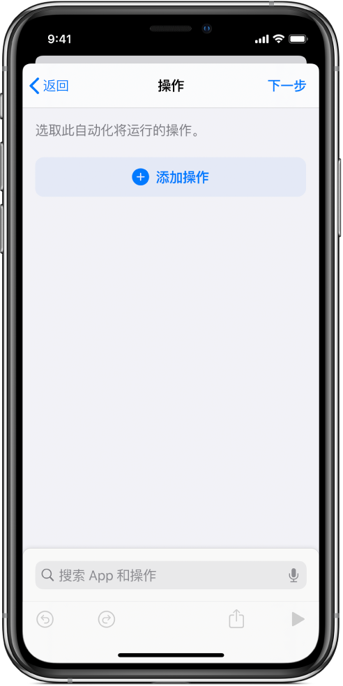 第六步,接着点击【添加操作】按钮,然后点击【APP】选项,再选择【快捷指令】。