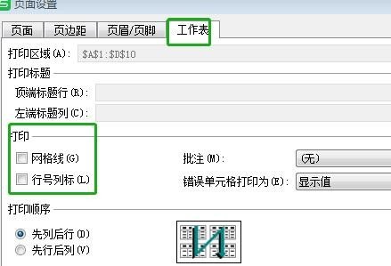 第六步、在“工作表”可设置是否打印网格线、是否单色打印、是否打印行号列标。还可设置是否打印批注,以及单元格出现“错误值”时的打印。