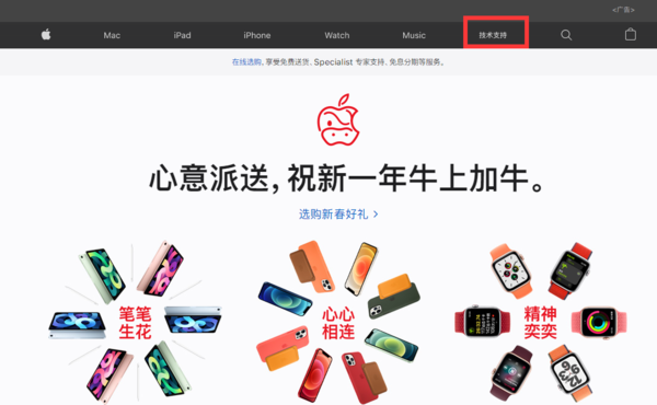 情况三:打开苹果官网(https://www.apple.com.cn/),点击进入【技术支持】页面,然后点击选择【忘记了Apple?ID或密码】选项。