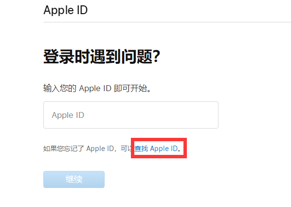 找回密码是需要在苹果官网完成,开始进入的步骤跟上文的“情况三”一致,只不过是到了【登录时遇到的问题】页面,直接输入Apple?ID点击【继续】进入【Apple?ID账户页面】,点击下方的【忘记了Apple?ID?或密码】。