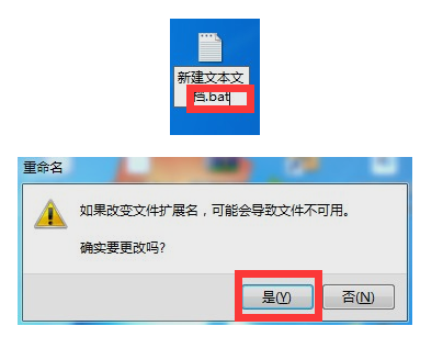 第三步,txt文档的扩展名改为【.bat】,这时候会弹出一个提示框,单击按钮【是】即可。