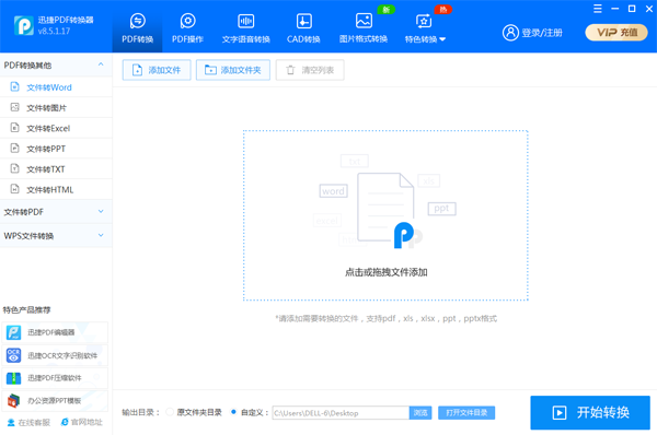 一般ppt文件的页数会比较多,或者是多个ppt文件需要转换时。借助这款工具可以完成文件转换的操作。首先需要在电脑中下载安装然后打开,弹出对应的功能界面。因为该软件默认的是“PDF转换其他”功能,所以需要选择一下“文件转PDF”中的ppt转pdf。这样就可以往对应的页面中添加文件。其中添加文件的方式有多种,我们即可选择对应添加文件的按钮,也可以使用拖拽的方式将其拖拽到指定的区域。