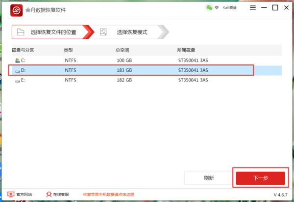 第二步,进入到软件的主界面当中后,我们在【选择恢复文件的位置】界面当中,选择需要进行恢复的文件的电脑的位置,比如【D】盘,然后点击窗口下方的【下一步】按钮。