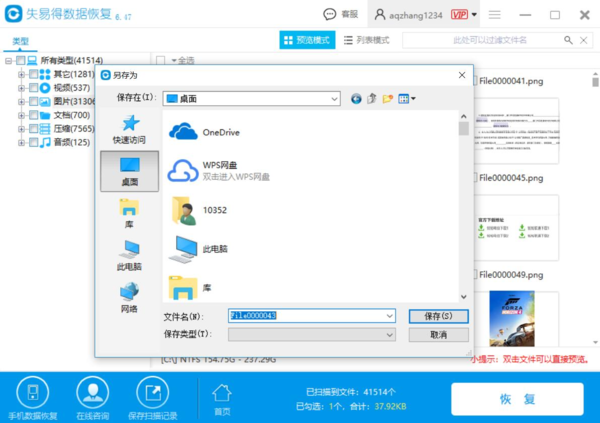 第五步,然后勾选好需要进行恢复的文件,然后点击【恢复】按钮,接着选择好恢复文件的存储路径,就可以进行文件的恢复了。
