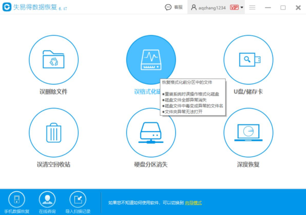 第一步,在电脑上下载并安装失易得数据恢复软件,软件安装成功后,双击打开。进入到软件的主界面当中后,我们点击选择【误格式化磁盘】功能。此功能主要是针对U盘数据、移动硬盘以及各类存储卡等的数据恢复。