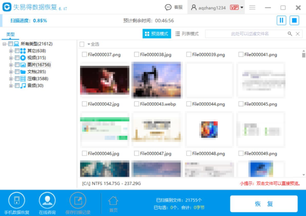 第四步,接着软件就会开始进行扫描了,扫描的同时我们还可以进行预览,这样只要我们找到了需要恢复的文件,就可以进行恢复了,无需进行全部扫描,从而节省大量的时间。