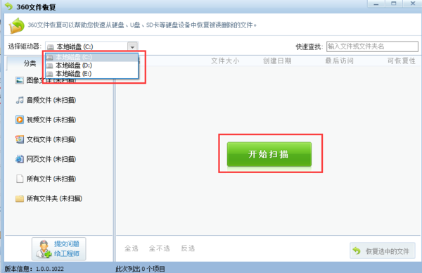 第二步,稍等片刻之后,进入【360文件恢复】对话框,在【选择驱动器】处,点击选择需要恢复的文件位置,我们这里是清空的回收站,选择C盘点击右边的【开始扫描】即可。