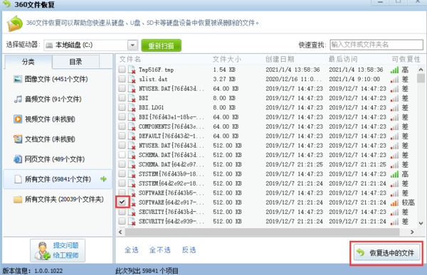 第三步,在众多扫描结果中,找到并勾选需要恢复的文件,然后点击右下角的【恢复选中的文件】按钮。