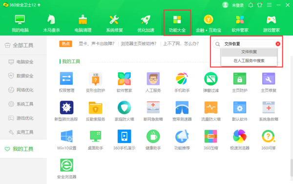 第一步,打开360安全卫士进入主页面,点击上方的【功能大全】模块,直接在【我的工具】中搜索【文件恢复】即可。如果我的工具中已经有了【文件恢复】,那就直接点。