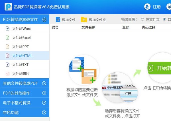 第一步,双击打开迅捷PDF转换器,在主页的左侧选择转换格式,展开【PDF转换成其他文件】选项,然后选择【文件转HTML】。