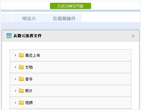 第三步,如下图所示,点击一下就绑定微云了,大家就可以从云盘上查看邮件信息了。